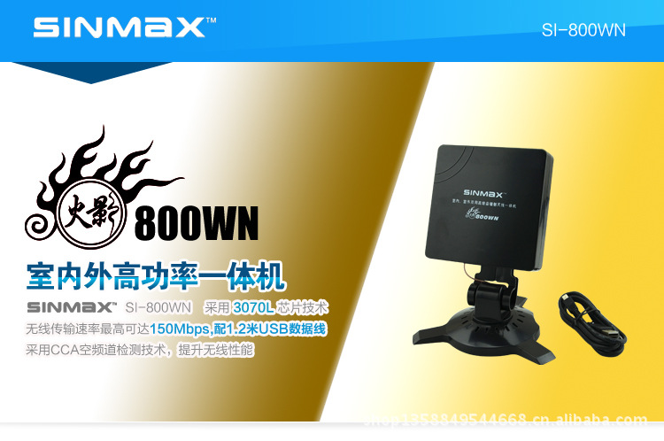SI-800WN无线网卡品牌 : SINMAX型号 :SI-800WN操作系统 :Windows98SE,Me,2000,XP,Vista,WIN7,MAC系统接口 : USB接口速度 : 150M连接方式 : 无线网卡技术规格 : IEEE802.11b,IEEE802.11g,IEEE802.11N加密方式 : 支持64/128/152位WEP加密,支持WPA/WPA-PSK、WPA2/WPA2-PSK等高级加密方式特性 :36DBI 天线包装清单 : 网卡×1;说明书×1;保修卡×1;驱动光盘×1
