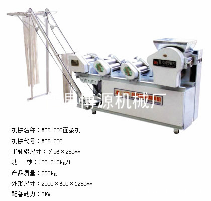 河北邢台博源机械厂MT40型 MT60型 MT80型 MT100型 MT125型面条机是总结我厂多年来生产面条机的经验,并吸取各类机型之长而创新设计的新型产品,从材料选用、客服噪音、安全特性、结构造型、都能力求符合当前的需求特点。尤其在卫生与安全方面,整机与面接触部件均采用不锈钢材料,其它零件也经防腐处理。