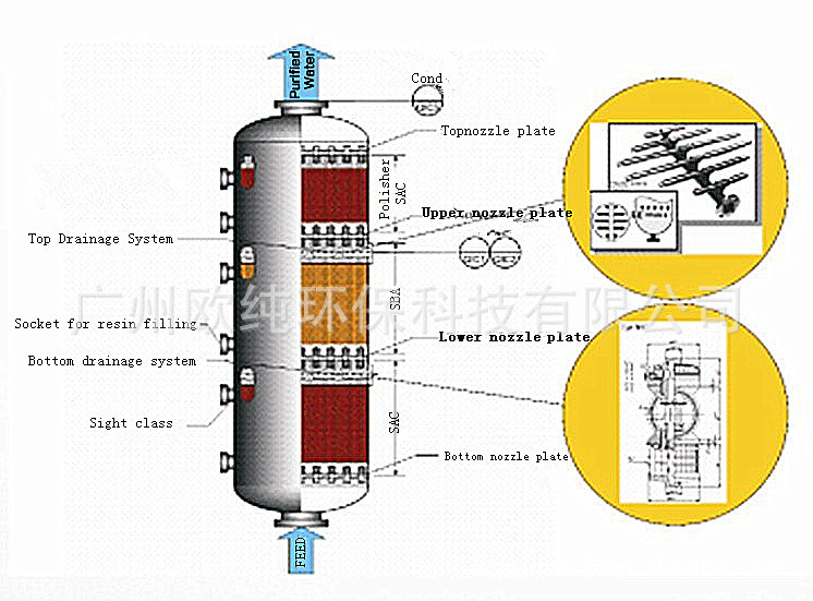 混合床离子交换器,简称混床,是将阴阳树脂按一定比例装置填在同一交换器中,运行前将他们混合均匀。此时被处理水在通过混合离子交换床后,所产生的氢离子和氢氧根离子立即生成溶解度很低的水。混合床串联子反渗透或一级复床除盐系统後面,用于纯水或高纯水的制备。