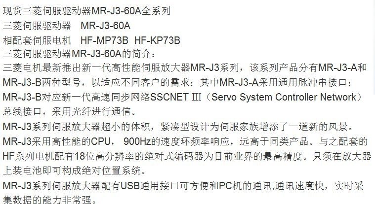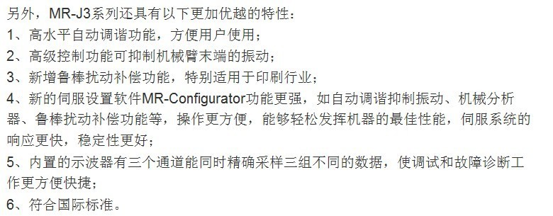 三菱通用交流伺服放大器MR-J3系列是在MR-J2S系列的基础上开发的具有更高性能和更高功能的伺服系统,其控制模式有位置控制,速度控制和转矩控制以及它们之间的切换控制方式可供选者。●该伺服放大器应用领域广泛,不但可以用于机械工具和一般工业机械等需要高精度位置控制和平稳速度控制的应用,也可用于线性控制和张力控制的领域。●该产品具有USB和RS-422串行通讯功能,通过安装有伺服设置软件的个人计算机就能进行参数设定,试运行,状态显示监控和增益调整等操作,该产品具有高水平自整定功能和高级振动抑制控制功能。●与MR-J3系列配套的高性能伺服电机编码器采用了分辨率为262144脉冲/转的绝对位置编码器,速度环路频率响应提高到900HZ,具有高速/大转矩特性,所以比MR-J2S系列具有进行更高精度控制的能力。●多种系列伺服马达适应不同控制需求,马达上的编码器均支持ABS模式,只要在伺服放大器上另加电池,就能构成绝对位置系统。●功能更强的伺服设置软件MR-configurator使用更为方便,具有精确的机械分析功能