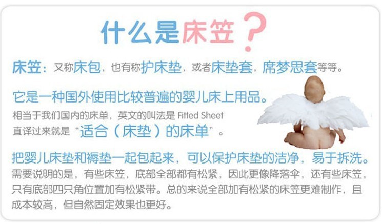 婴儿床笠在国外比较流行,fitted sheet把婴儿床垫和褥垫一起包起来,可以保护婴儿床的的洁净,易于拆洗。