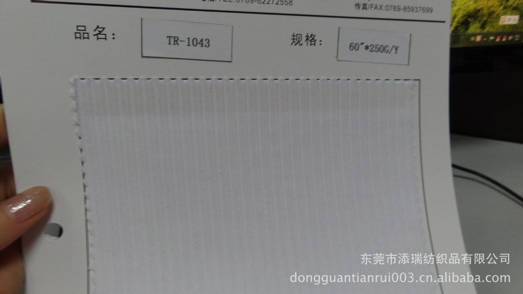 东莞市添瑞纺织品有限公司位于中国广东省东莞市厚街镇厚沙路祠边小区三横路17号,是一家三明治网布、网眼布、起毛布、莱卡布、佳绩布、绒布、SBR贴合、弹力布、EVA贴合、防霉抗菌处理、吸湿快干处理、超细起毛布、特殊三明治网布、边纶布、TPU贴合、潜水料、内里布、泡棉、织带、鞋材等产品的经销批发的股份有限公司。产品畅销消费者市场。公司与多家零售商和代理商建立了长期稳定的合作关系。品种齐全、价格合理。并通过ISO90001质量管理体系认证。可以通过ROHS和REACH检测标准测试。是一家实力雄厚,重信用、守合同、保证产品质量,诚实守信的公司。以多品种经营特色和薄利多销的原则,赢得了广大客户的信任。