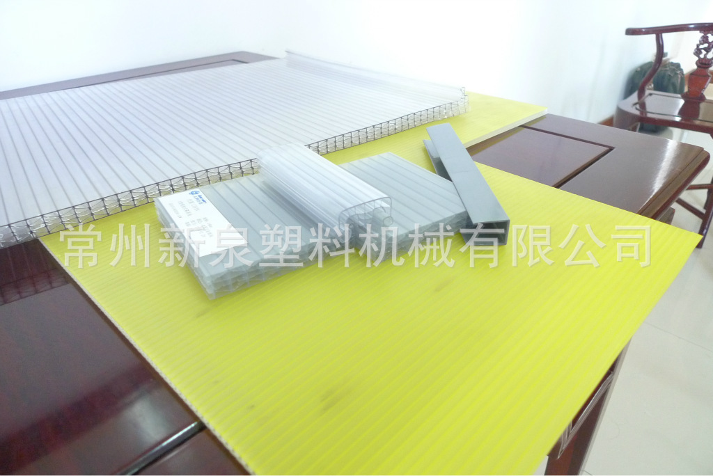 该生产线主用于生产PC型材(型材截面由客户定制)。此型材均由聚碳酸脂经整体挤出成型而成。产品具有:质轻、无毒、耐腐蚀、绝缘、良好的机械性能。