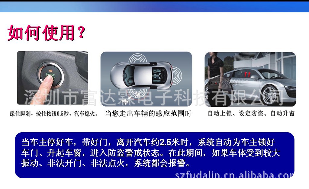 1.自动开关门锁:车主靠近汽车,自动打开门锁。车主下车后,离开汽车2~3米,车门自动上锁。