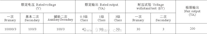 | 额定电压比(V) | 准确级及额定输出 | 极限输出(VA) | 额定绝缘水平KV | | 0.2 | 0.5 | 1 | 3 | 6P | 6000/√3/100/√3/100/√3 6000/√3/100/√3/100/√3/100/√3 | 75 | 120 | 200 | 500 | 120 | 1000 | 7.2/32/60 | 10000/√3/100/√3/100/√3 10000/√3/100/√3/100/√3/100/√3 | 12/42/75 |