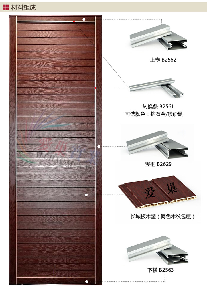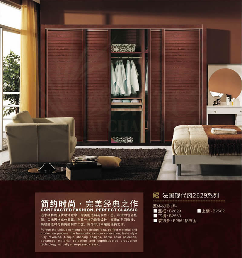 统色同色彻底解决衣柜移门板、柜体整体木纹颜色统一问题,铝合金框材与门板、柜体、百叶板花色纹路完全协调一致,逼真实木效果,木纹清晰,木质感强,手感温暖,纯美无暇。 质量保证采用欧洲领先生产技术和设备,确保铝合金框材贴面、百叶板贴面质量,国际品质,放心之选。 绿色环保全力推广铝材贴面技术取代木材资源,并使用指定的原装韩国进口零甲醛聚胺脂胶水,百叶板选用E级基材和绿色高分子材料,纯进口环保PVC,严格执行欧洲环保标准,全面展现高端形象。 独家统配提供统一配套理念和服务的同色木纹铝合金框材、木板、百叶板生产厂家,一体化生产销售同色木纹铝材、同色木纹百叶板、同色木纹高分子PVC百叶板等,并有指定一级同色木纹木板供应商。 选择多样同色爱巢红、同色苹果木、同色金橡木、同色檀木、同色柚木等二三十款纹路色系,丰富多彩,任您自由选择搭配。 整体衣柜移门铝合金边框材料说明: 本公司生的所有衣柜门(包含2629系列)边框使用的材质为钛镁合金铝材包覆,目前,市场上整体衣柜门使用的边框材料有铝合金、碳钢材料、铝钛合金和钛镁合金,后两种材质最为坚固耐用。铝材又分为国标A磅铝、B磅铝、太空铝,国标A磅铝最好,一次性成型,横截面光亮、无杂质,铝材纯度最高,B磅铝次之,太空铝为二次废铝再利用,久之容易氧化、发黑。 木塑百叶功能板材《长城板》样式:如下图