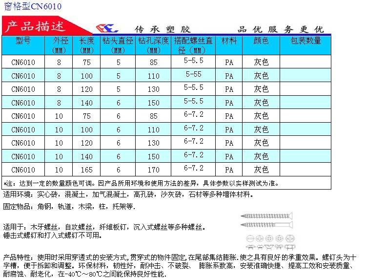 传承塑胶电子有限公司是一家专业生产及销售 塑料膨胀螺丝、塑料膨胀管、锚栓、胶塞、墙塞、PE塑料膨胀管 、PA膨胀管、钢钉线卡、陶瓷十字架、尼龙扎带及各 类紧固件的企业。本公司产品多达60多种款式,400多个规格,均可满足90%以上客户需求,并能根据客户要求开发模具及订做非标产品。 产品符合绿色ROHS认证。支持支付宝担 宝交易。秉承“客户第一,合作 共赢”的经营理念,致 力于打造一流的渠道供应商和销售平台。 产品采用PE / PA6/PP/PA66等原料制造。品质优良、荷载大、用途广、安装 准确快捷、提高工效和安装质量,产品造价低、韧性好、拉力好、耐冲击、不破 裂、硬度强、不生锈、耐腐蚀、耐老化、适用温度(—40~+80)。 广泛适用于混凝土 及致密的天然石材,实心砖、空心砖、高孔砖、加气混凝土、石膏板,石膏硬纸 板及厚度在15mm以上的板材,底板,支承板,托架,栏杆,窗, 门,幕墙,支架、楼梯、外墙饰面等。 精湛的技术,优良的品质 ,优质的服务。热情欢迎新老客户莅临指导! 本店所有宝贝图片均为实物拍摄,由于灯光 、环境、显示器色彩偏差等原因,或会导致实物与照片存在一些微小的差异,最 终颜色以实物为准。 此标价均为最小规格价格,其他规格价格请旺旺联系。 以下为产品质量认证书