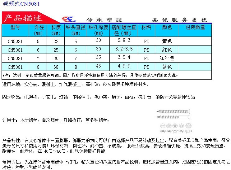 传承塑胶电子有限公司是一家专业生产及销售 塑料膨胀螺丝、塑料膨胀管、锚栓、胶塞、墙塞、PE塑料膨胀管 、PA膨胀管、钢钉线卡、陶瓷十字架、尼龙扎带及各 类紧固件的企业。本公司产品多达60多种款式,400多个规格,均可满足90%以上客户需求,并能根据客户要求开发模具及订做非标产品。 产品符合绿色ROHS认证。支持支付宝担 宝交易。秉承“客户第一,合作 共赢”的经营理念,致 力于打造一流的渠道供应商和销售平台。 产品采用PE / PA6/PP/PA66等原料制造。品质优良、荷载大、用途广、安装 准确快捷、提高工效和安装质量,产品造价低、韧性好、拉力好、耐冲击、不破 裂、硬度强、不生锈、耐腐蚀、耐老化、适用温度(—40~+80)。 广泛适用于混凝土 及致密的天然石材,实心砖、空心砖、高孔砖、加气混凝土、石膏板,石膏硬纸 板及厚度在15mm以上的板材,底板,支承板,托架,栏杆,窗, 门,幕墙,支架、楼梯、外墙饰面等。 精湛的技术,优良的品质 ,优质的服务。热情欢迎新老客户莅临指导! 本店所有宝贝图片均为实物拍摄,由于灯光 、环境、显示器色彩偏差等原因,或会导致实物与照片存在一些微小的差异,最 终颜色以实物为准。 此标价均为最小规格价格,其他规格价格请旺旺联系。 以下为产品质量认证书