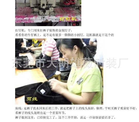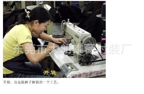 详细的牛仔裤生产工艺流程牛仔裤在生产缝制中一般采用流水作业,整个制作流程包括款式、规格及生产工艺的设计,还包括验料、排料、铺料、裁剪、缝制、水洗、熨烫、烘干和整形等多种生产工艺。以下介绍的牛仔裤生产工艺流程主要是针对五袋款牛仔裤。为确保牛仔裤产品质量的稳定性,在制作过程中,需制定一系列工序并加以控制。从面料到裁片,各工序与流水线之间的流程安排直接影响到投入和产出两方面。1、产前阶段产前阶段,生产定货单是来自客户信息的原始资料:记录牛仔裤样品、样板、水洗处理色标、是否有修正、注意事项等。以上资料被核对后即发送到相关部门。生产开始,要制定产品的生产流程图表。生产技术部门与客户共同协定、修正样板和样衣,以便制定生产工序和降低成本。有了详细的制作程序,就展开工作,将修正后的样板和样衣提供给裁剪部门计算用料率、排料、提料、辅料、裁剪,并将裁片分包捆扎送达缝制车间。2、缝制(分为5部分)将裁好的衣片分包捆扎,按工艺师安排分别发送到缝制流水线的指定工位上。以牛仔裤缝制为例,前后片的缝制一般同时分别进行,在进一步缝合之前,要对半成品进行检验。锁扣眼前,同样要进行检验。一些个别工序,如制穿带袢、清除口袋里的沙子、剪线头、钉铆钉和钉按扣等,可以被灵活安排于制作过程的工艺流程里。例如,制作五袋款普通拉链门襟的牛仔裤,其工序可分为五组:做前片、做前门襟及绱拉链、做后片、组装缝合、套结及钉扣锁眼。1)前片前裤片的工序涉及缝制前侧插袋。将相关裁片如左右袋布、标签、小侧片和前裤片等分配给机工缝制前侧插袋。先在左袋上车缝标签(水洗说明和厂标),接着车缝硬币袋袋口明线,并将其缉在右侧片相应位置。将袋布分别缝合在左、右侧片上,与前片缝合前把兜布做好,固定袋布并将前片半成品过渡到下一组工序。2)做前门襟及绱拉链绱拉链前,机工要准备好左右门襟裁片和前裤片半成品。缝合好双折的底襟,将其正面转递下道工序。左右门襟和前片裆部包缝,把左半边拉链布带缉在左门襟贴边上,并与前片缝合,在左裤片上车缝门襟造型线。然后,车缝右半边拉链与底襟,并与右裤片缝合。本组工序最后一步:缝合前裆,缉明线。前片半成品在继续缝合前要通过质检。3)后片工人事先准备好左右后袋、后育克、后裤片和袋上的标签。第一道工序:用特制的模板确定后袋造型线并修正尺寸,其目的是为下一道工序描绘出袋上的纹样和做份的宽窄。机工根据描绘的纹样车缝后袋装饰线,然后用熨斗或折袋机扣出后袋造型。与此同时,其他机工缝合后裤片和育克,最后把后袋和标识绱在后片上。与前片一样,后片半成品在继续缝合前要通过质检。4)缝合缝制完成后袋和门襟拉链后,工人开始缝合前后片。车缝牛仔裤侧缝明线,以加固前后裤片的牢度。然后绱腰头,并在折裤口贴边前缝合下裆。缝下道工序:用穿带袢机制出所需长宽规勤务员的腰带袢,一般牛仔裤有5个腰带袢:一个在后中缝,前片左右袋口各一个,另两个在前袋至后中缝之间的位置。同样,进入到下一工序之前,要进行质量检验。5)套结牛仔裤的腰头上锁头扣眼,尾部套结加固。另外,腰带袢、门襟、后袋、裆等重要部位也要套结加固。最后,将皮标牌缝在腰头上。3、包装缝制完成,水洗处理是牛仔裤制作中不可或缺的工序。经过水洗处理后,牛仔裤进入到包装车间。工人们开始对其进行检验:剪掉前裤片、腰袢上的线头,清除口袋里面的沙子,并在初次整烫和验货前安上按扣和铆钉。通过质检的产品,要测量牛仔裤腰围和下裆尺寸,经二次整烫,装上吊牌、腰牌和后袋吊牌,把牛仔裤装进塑料袋,放入硬纸盒,等待最终验货。