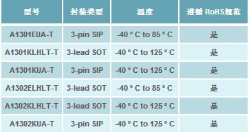这些功能使 A1301 和 A1302 在线性目标移动和旋转目标移动的位置检测系统中成为首选。它们非常适合于温度范围较宽( -40°C 至 125°C )的工业应用。