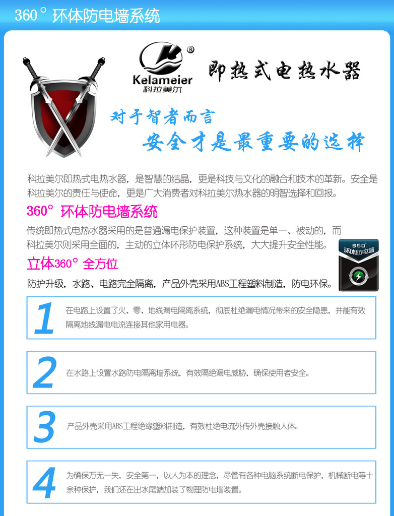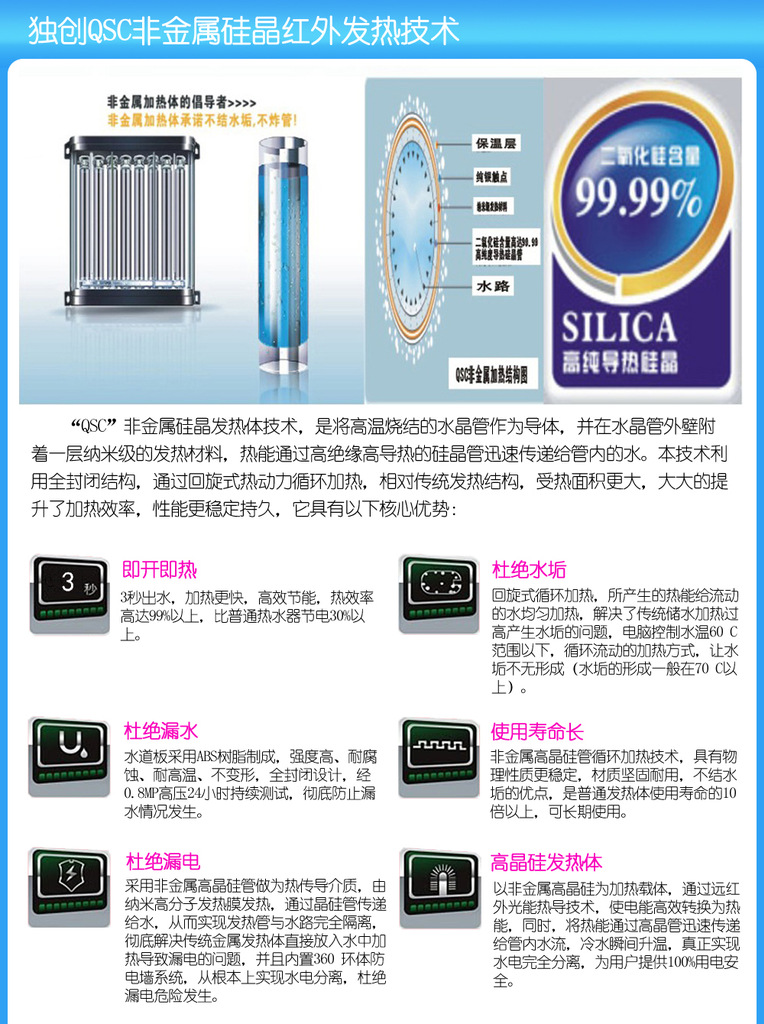 | 1、省时; 2、省水; 3、省电; 4、省心; 5、省空间; 6、水电分离非金属发热更安全; | 1、安 全; 2、清洁美观; 3、安装简单; 4、使用方便; 5、使用费用低; | 1、安装方便; 2、节省空间; 3、使用方便; 4、更加实用; |