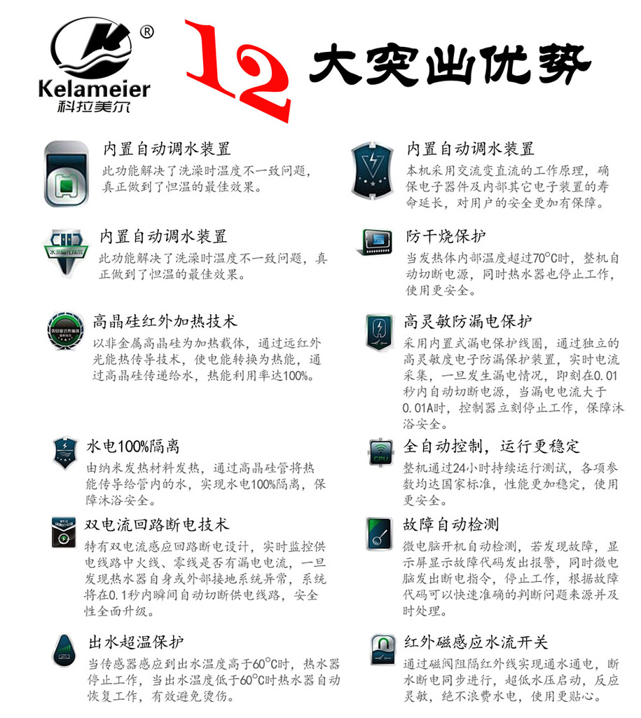 可用于浴室、宾馆、家庭卫生间!全自动模式,洗浴时间、电量自动记忆功能、数码液晶显示可硅无极功率显示、漏电保护、超温保护、超压保护、防干烧保护、故障自检、3秒出热水,水电分离,通水通电。独有的石英晶体管循环系统,DTR氧化加热专利技术,迅速加热,即开即热源远流长,多档功率任意调节,六重保护,安全可靠,封闭后制式设计,一机多点使用。