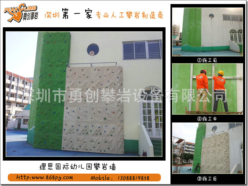 深圳市勇创攀岩设备有限公司 是从事体育休闲产业设施的专业供应商.自成立以来,就一直与世界顶级体育设施供应商紧密合作,积累了丰富的产品和实际营造经验,不断地推出符合国际发展趋势和国内用户需求的新产品,确保公司在该领域处于领先地位。它是深圳第一家专业从事人工攀岩制造商,是深圳唯一拥有移动攀岩墙设施租赁的公司.