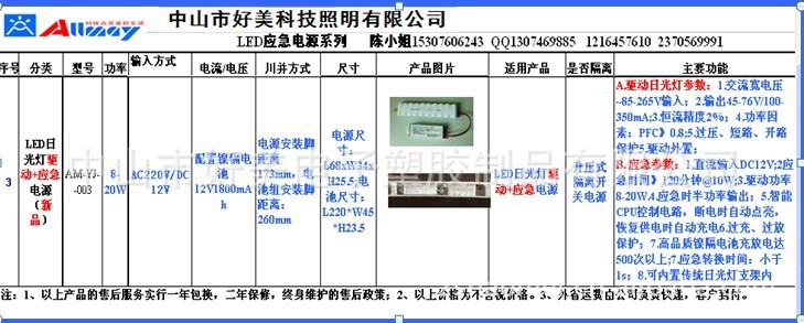 A.驱动日光灯参数:1.交流宽电压~85-265V输入;2.输出45-76V/100-350mA;3.恒流精度2%;4.功率因素:PFC》0.8;5.过压、短路、开路保护5.驱动外置; B.应急参数:1.直流输入DC12V;2应急时间》120分钟@10W;3.驱动功率8-20W.4.应急时半功率输出;5.智能CPU控制电路,断电时自动点亮,恢复供电时自动充电6.过充、过放保护;7.高品质镍隔电池充放电达500次以上;7.应急转换时间:小于1s;8.可内置传统日光灯支架内
