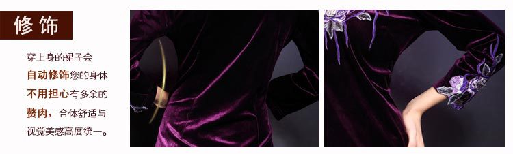 本款面料采用韩国原装进口的丝光绒面料,不但光泽效果柔和华丽,手感和穿着感都非常的柔软舒适,进口的绒面品质非常出众,面料本身四面都有弹力。丝绒手感顺滑防静电不沾尘,成衣呈现出与无论比的奢华天鹅绒质感,穿上身的裙子会自己动修饰您的身心不用担心有多余的赘肉,无论您的坐姿如何,当您站立时绝不会出现绒面出花不均匀的尴尬现象,复古民族格调的领口后肩部与袖口的超重工立体高端刺绣花相之呼应,让您再次展现知性气质之美。
