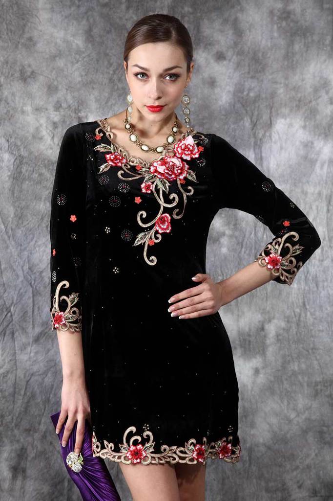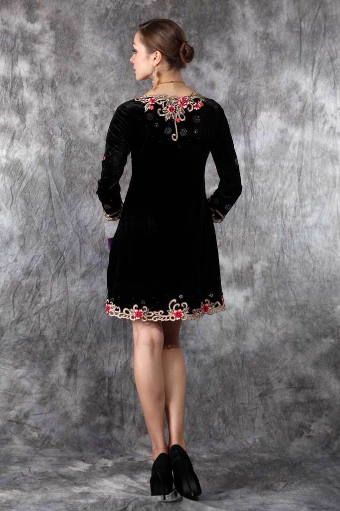 本款面料采用韩国原装进口的丝光绒面料,不但光泽效果柔和华丽,手感和穿着感都非常的柔软舒适,进口的绒面品质非常出众,面料本身四面都有弹力。丝绒手感顺滑防静电不沾尘,成衣呈现出与无论比的奢华天鹅绒质感,穿上身的裙子会自己动修饰您的身心不用担心有多余的赘肉,无论您的坐姿如何,当您站立时绝不会出现绒面出花不均匀的尴尬现象,复古民族格调的领口后肩部与袖口的超重工立体高端刺绣花相之呼应,让您再次展现知性气质之美。