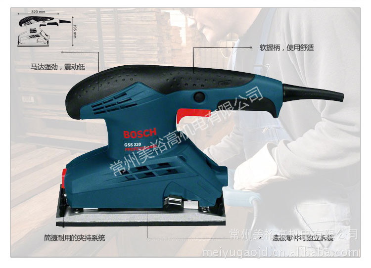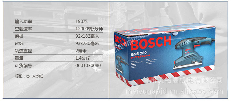 主要特点:操作舒适,低震动;马力强劲,适于重负载作业;底板零件可独立更换;砂纸快速夹持系统;冷却/排尘的双风道设计,性能卓越。适用范围:本机器适合在木材、塑胶、填隙料和上了保护漆的表面进行干磨作业。技术参数:磨板:92x182毫米砂纸:93x230毫米输入功率:190瓦空载速率:24,000转/分钟轨道直径:2毫米重量:1.4公斤
