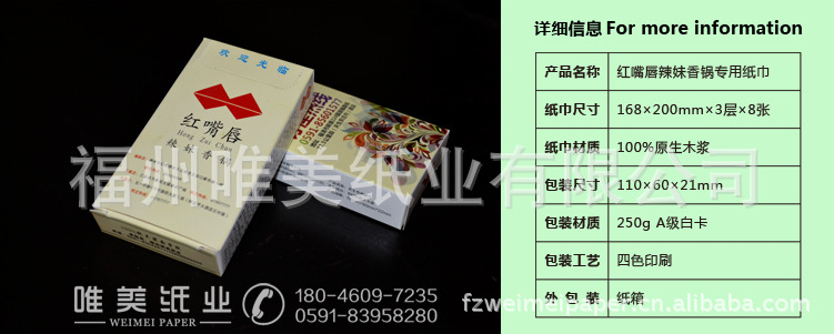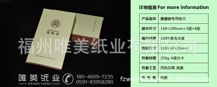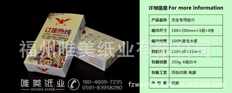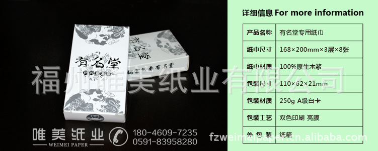 福州唯美纸业有限公司是一家专业的纸巾生产厂家,成立于2011年,巨资引进台湾最先进的成套纸巾生产机器,全电脑控制,人机对话装置。专业生产各种广告纸巾、礼品纸巾、湿巾、面巾纸、抽纸、擦手纸、软抽、盒抽、宾馆纸巾、酒店餐巾纸等,涉及广告礼品行业、餐饮业、娱乐业、房地产、加油站、酒业、家具业、医药行业、美容业、企事业单位福利、知名饮料、食品厂家产品宣传等多个行业。因包装印刷精美、受众幅面广,为众多大中型公司的产品推波助澜,对品牌推广起到了一定的媒介作用。我们还可以根据客户要求订做个性化规格、颜色、款式的纸巾。质量有高中低档,任其选用。各类钱夹式广告纸巾,荷包式广告纸巾,抽式盒装广告纸巾,三片装钱夹式广告纸巾,6-8片装钱夹式广告纸巾,三片荷包式广告纸巾,6-8片装荷包式广告纸巾,50抽盒装广告纸巾,80抽盒装广告纸巾,100抽盒装广告纸巾,120抽盒装广告纸巾。