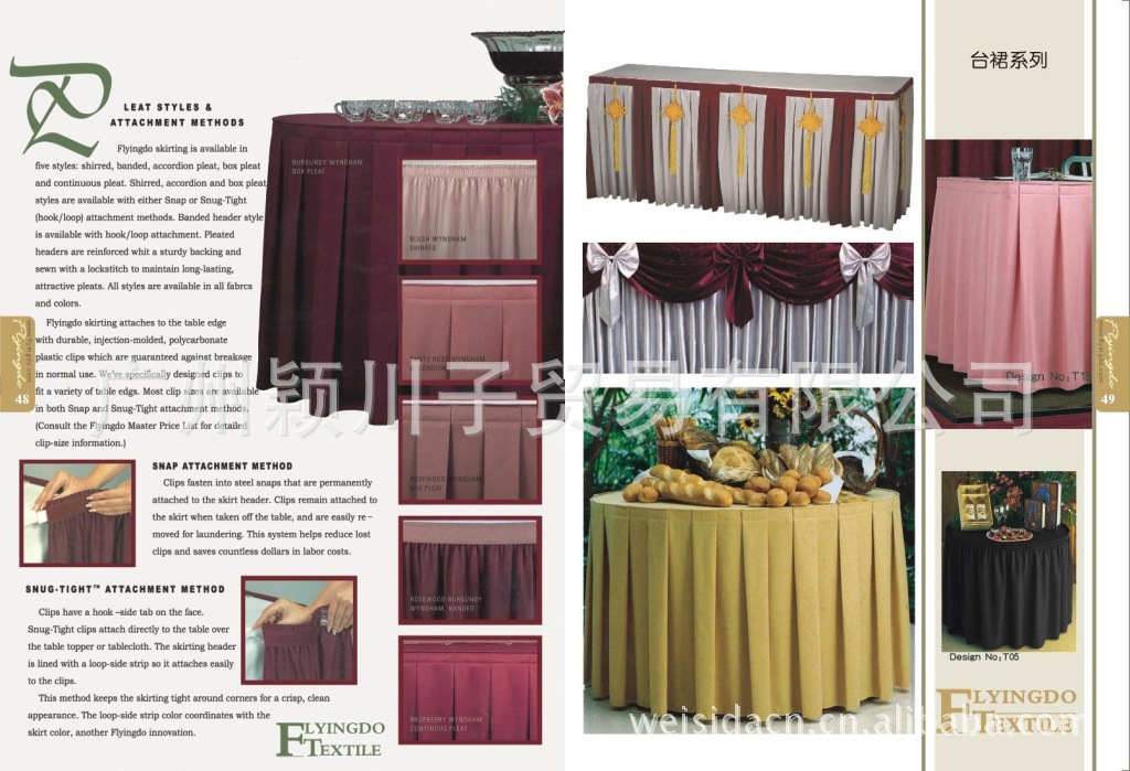 商品名称: 颖川酒店桌布台布 会议室台布 会议台裙 布草 工字折 桌裙 品 牌: 颖川 规格(mm): 会议桌布和桌裙的尺寸一般都是不一样的,这个就需要亲们测好尺寸,我们为