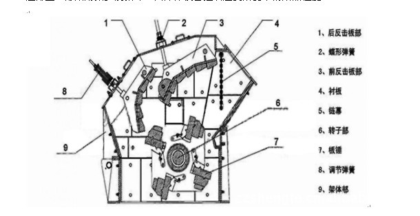 反击式破碎机是一种利用冲击能来破碎物料的机械设备。本机工作时,在电动机的带动下,转子高速旋转,物料进入板锤作用区时,与转子上的板锤撞击破碎,后又被抛向反击装置上再次破碎,然后又从反击衬板上弹回到板锤作用区重新破碎,此过程重复进行,物料由大到小进入一、二、三、反击腔重复进行破碎,直到物料被破碎至所需粒度,由出料口排出。调整反击架与转子之间的间隙可达到改变物料出料粒度和物料形状的目的。