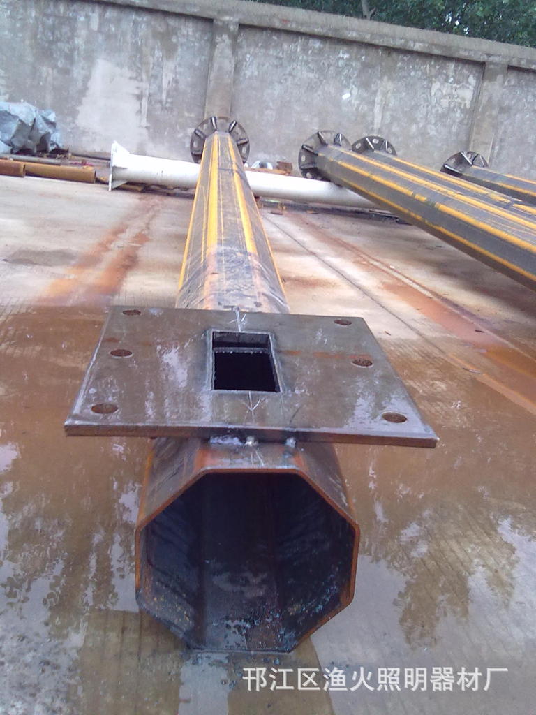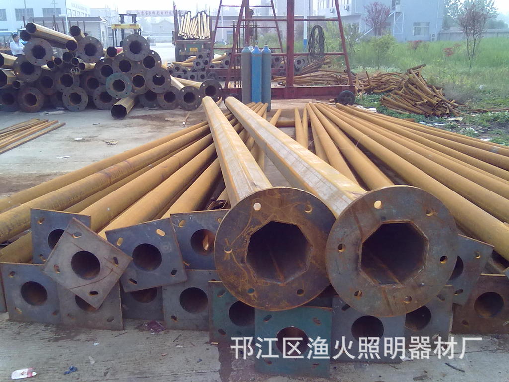 4. 修补打磨。修补打磨是对自动焊接后的管坯缺陷进行修补。修补人员应该逐根检查,发现有缺陷的地方进行补,补焊完成后,再进行修磨,修磨的接处与自动焊缝基本相同。 5. 整形。整形工序包括灯杆的调直及坯杆两头的整圆及多边形对角线尺寸,一般公差:<±2mm。坯杆直线度误差不超过:≤±1.5/1000。 6. 齐头。齐头工序是把弯成的管坯两端修平,保证管口与中心线垂直,不存在角度及高度不平,同时修平后,进行端面磨光。 7. 装底板。点焊底法兰和筋板,关键是保证底法兰与灯直中心线垂直,筋板与底法兰垂直,同时与灯直母线平线。 8. 焊底法兰及筋板。焊接要求参照国家标准的焊接工艺,保证焊接质量焊接缝要美观,没有气孔、夹渣。 9. 开门。本工序在工作过程中,必须胆大心细(1)首先要看清图纸确定门的方向,然后按照图纸尺寸定位。尺寸包括:上下、左右,及门框尺寸大小,等离子切割时要心细,保证割缝一直线,同时割下的门板与灯杆配号用电焊烧字。 10. 焊门条、电器条、锁座。焊门条时20mm宽的门条,伸出8-10mm位置放下,特别是点焊时门条应紧贴灯杆,焊接要牢固。焊电器条及锁座,主要是按照图纸定好位置,锁座焊在门中间,误差≤±2mm,保持上面水平,不能超过灯杆。 11. 弯叉。弯叉工序与开门有相同性质,应该胆大心细。首先注意门的方向,第二注意起弯点,第三灯叉角度,牵引速度不能忽快忽慢,确促成品率100%。 12. 镀锌。镀锌好坏直接影响灯杆的质量,镀锌要求按国家标准执行镀锌,镀后表面光滑、无色差,不能有流挂,流挂严重的灯杆必须生重新返镀。 13. 喷塑。喷塑的目的是一是为了美观,二是为了防腐蚀 13.1 打磨:将镀锌杆表面用抛光砂轮磨平,保证灯杆表面光滑,平整。 13.2 调直:将打磨后的灯杆校直及口形的整形,灯杆不直度必须达到1/1000,口径要求:小杆≤±1mm;高杆≤±2mm。 13.3 装门板 13.3.1 把所有门板进行镀锌后的处理,处理包括挂锌、漏锌及锁孔中的存锌。 13.3.2 钻螺丝孔时必须电钻与门板垂直,门板四周间隙想等,门板平复。 13.3.3 螺丝固定后,门板不能有松动,固立必须牢固以防运输途中脱落。 13.3.4 喷塑粉:将装好门的灯杆进喷房,根据生产计划单要求塑粉颜色喷塑,然后进烘房,烘房温度及保温时间必须严格按各塑粉要求,以保证塑粉的附着力和光洁度等质量要求。