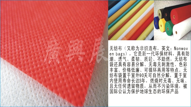 无纺布袋以无纺布为原料,它是新一代环保材料,具有防潮、透气、柔韧、质轻、不助燃,无纺布袋还具有容易分解、无毒无刺激性、色彩丰富、价格低廉、可循环再用等特点。无纺布袋置于室外90天可自然分解,置于室内使用寿命长达5年,燃烧时无毒、无味、且无任何遗留物质,从而不污染环境,被国际公