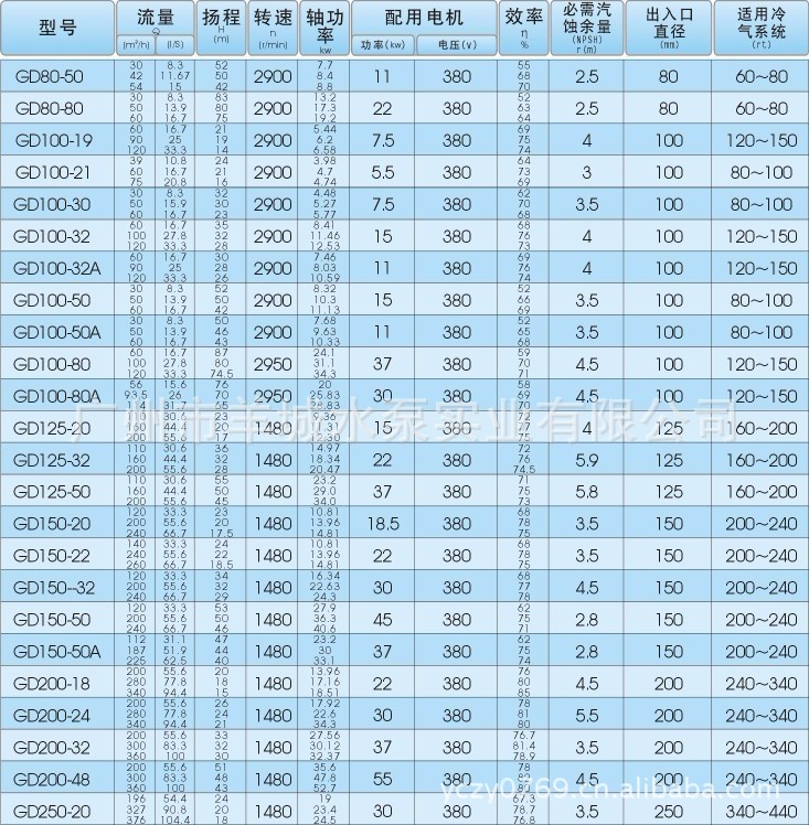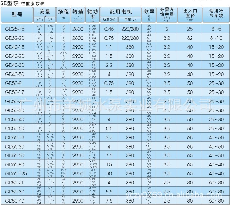 一、产品名称:GD管道泵 二、结构说明: 1、泵与电机直联; 2、 出入口同一水平轴线,立式安装; 3、 水力平衡方式消除轴向力; 4、既可单台或多台(按泵的工作压力)串联,亦可卧式或立式安装使用。 三、水泵特点: 1、泵与电机直联,外型美观;2、体积小、重量轻、安装方便 ,噪声低 2、GD型管道式离心泵适用于输送清水或物理化学性质类似于水的液体,液体温度<=100摄氏度。若介质温度大于100摄氏度,请选用GDR热水管道泵,在具有腐蚀性条件下,请选用GDF型耐腐蚀管道泵。 四、典型用途:输送常温下的清水或物理化学性质类似清水的介质 1、制冷、空调系统、冷却塔、冷却水循环; 2、一般供水系统; 3、管路加压、园林喷泉;4、消防供水; 5、若介质温度大于80℃,请使用GDR热水管道泵,腐蚀条件下请使用GDF型耐腐蚀管道泵。 五、型号说明(以 GD100—32A 为例) GD — 管道式离心泵;100 — 进出口直径;32 — 扬程32m;A— 叶轮第一次切割 六、产品用途 本泵主要用于自来水、空调系统、消防系统、冷却塔、水塔、园林喷泉、浴室、无压锅炉、高层建筑等冷热水加压,也适用于塑料机冷却水循环加压,化工流程冷却塔上水等等。 七、性能参数:口径:25~250mm ;流量:2.5~460m3/h 扬程:7~83m 转速:1480~2950r/min 八、型号 GD25-15 GD32-20 GD40-15 GD40-20 GD40-30 GD40-50 GD50-8 GD50-17 GD50-20 GD50-30 GD50-40 GD50-50 GD65-19 GD65-30 GD65-50 GD65-80 GD65-125 GD80-21 GD80-30 GD80-40 GD80-50 GD80-80 GD100-19 GD10-21 GD100-30 GD10-32 GD100-32A GD100-50 GD100-50A GD100-80 GD100-80A GD125-20 GD125-32 GD125-50 GD150-20 GD150-22 GD150-32 GD150-50 GD150-50A GD200-18 GD200-18 GD200-24 GD200-32 GD200-48 GD250-20 GD250-32 GD250-50 GD250-50A |