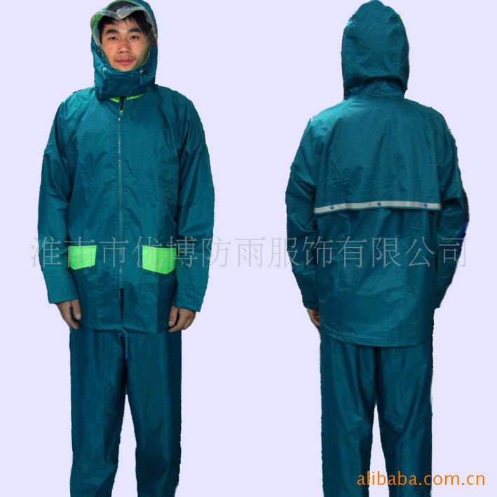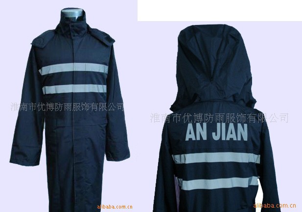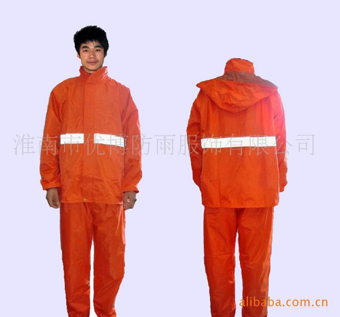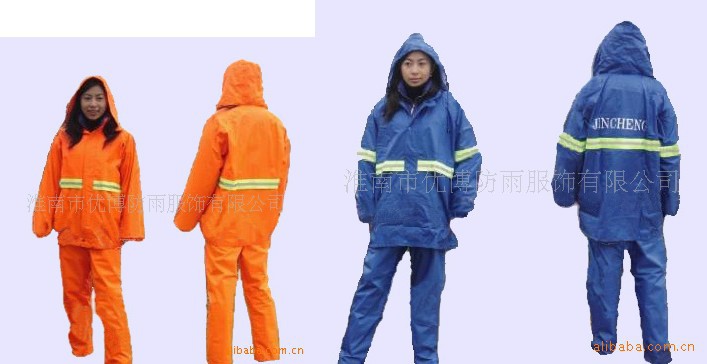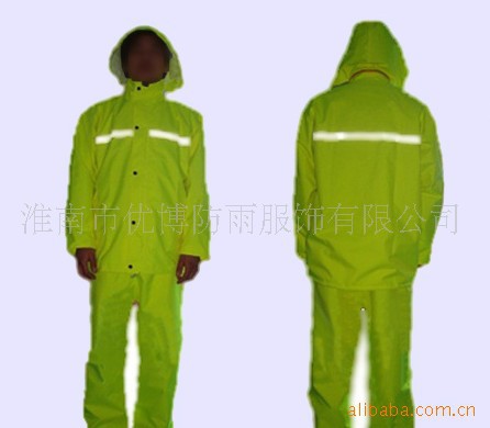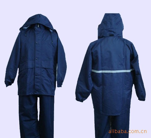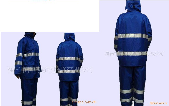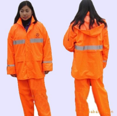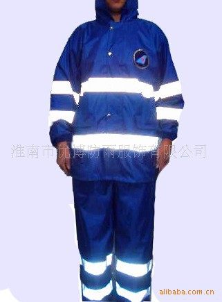 本品为涤纶190T面料,加PVC防水涂层,五公分高强度反光条,高强度永不褪光反光刻字,美观,大方,安全,双层防沾身透气网格设计,暗藏式帽子,上下身分体套装,防盗防水口袋,休闲款式。