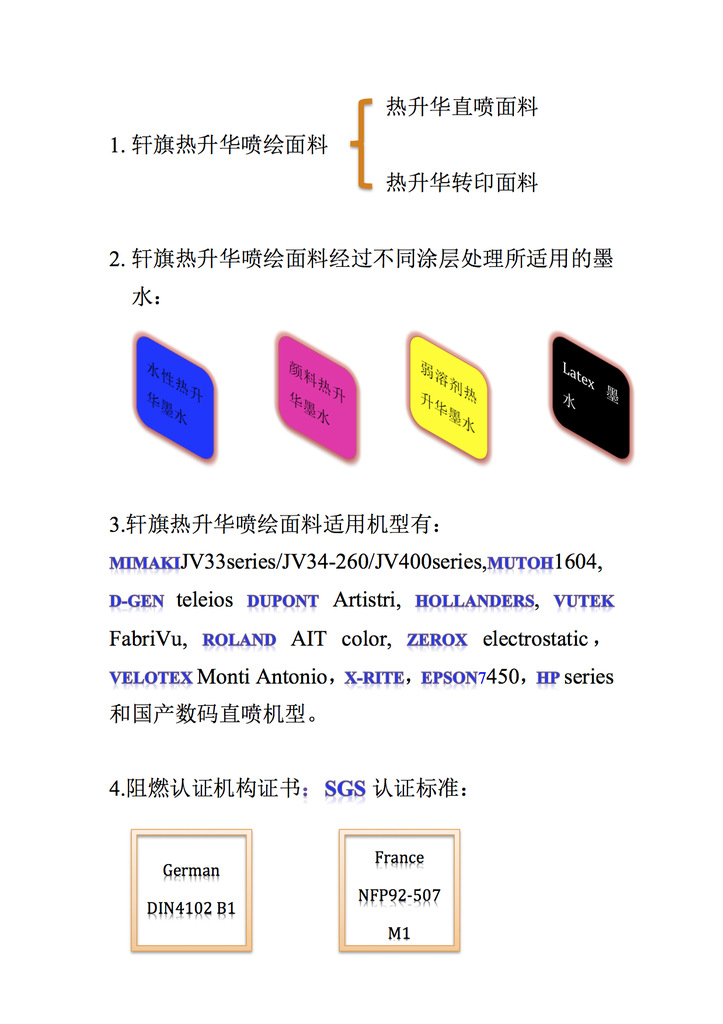 2、 我们的热升华数码直喷面料经过不同的处理,可分别用热升华水性墨水、热升华油性墨水、热升华弱溶剂墨水、颜料墨水和Latex 墨水。