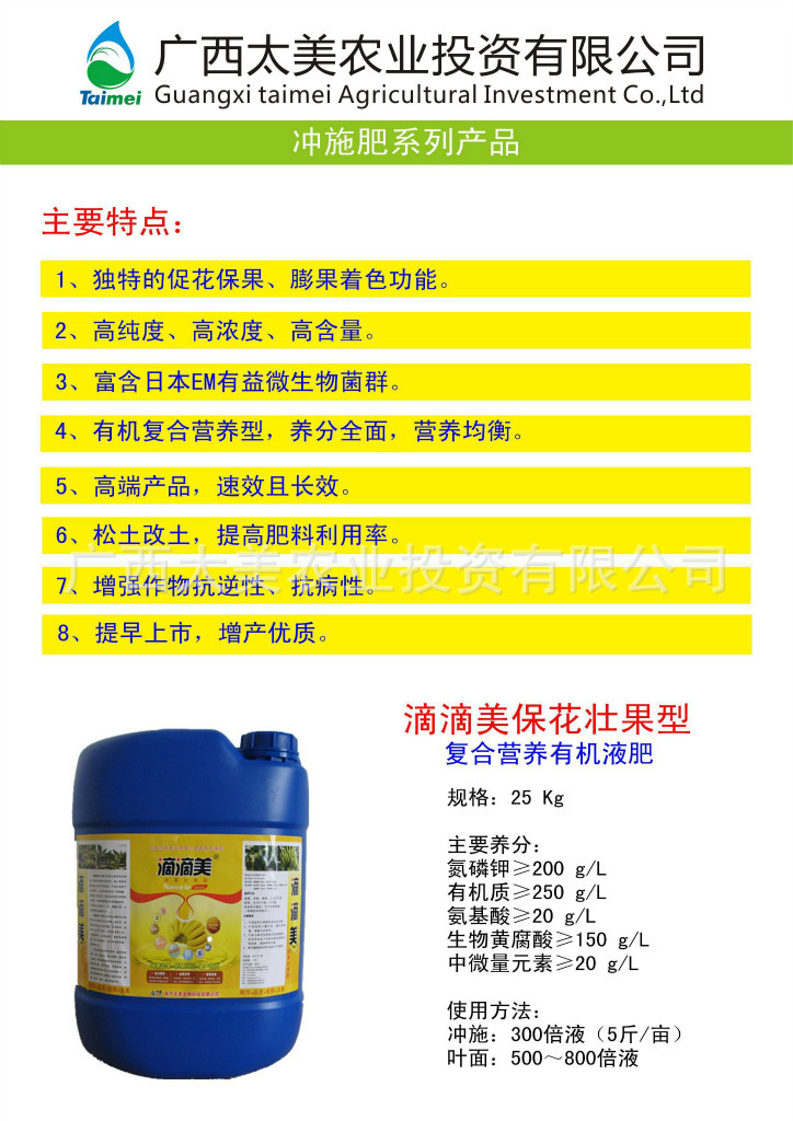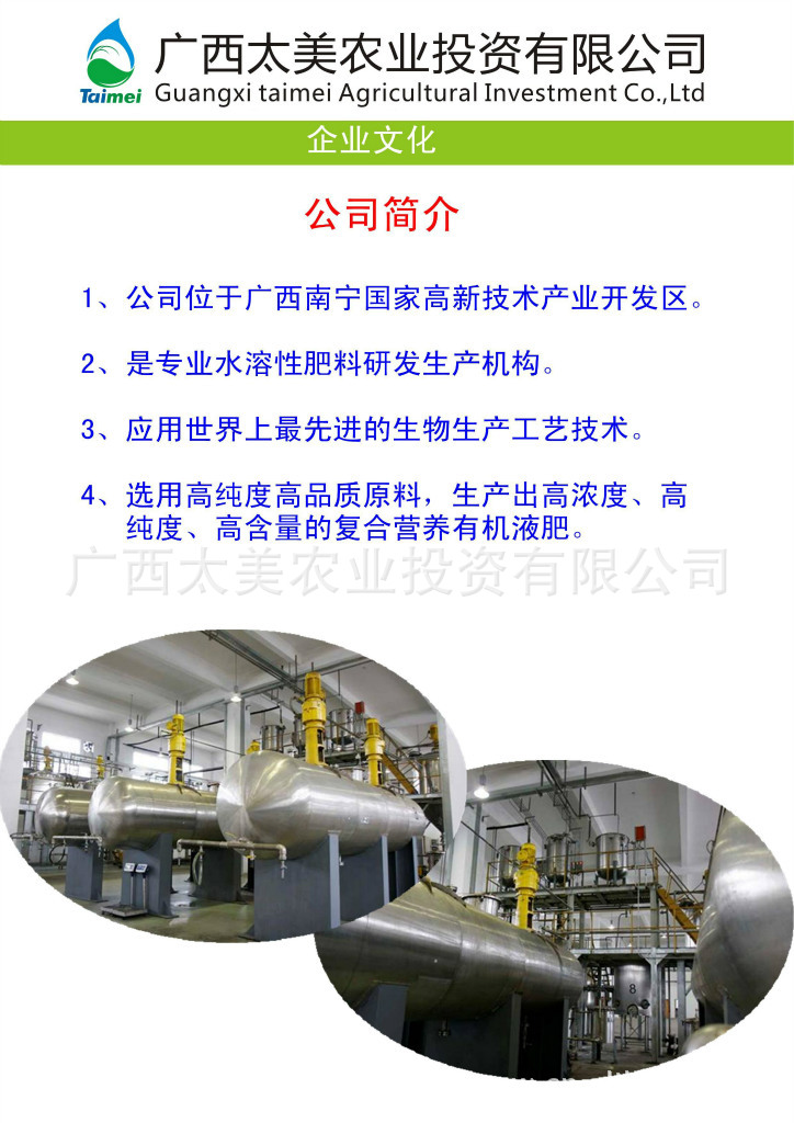 广西太美农业投资有限公司,是在南宁太美生物的基础上,引入广东供销联社、香港达能投资等战略合作伙伴重组而成,是一家集农业生物技术研发,虫害防治,有机液肥、水溶肥的生产销售,农业种植技术咨询,以及生态农产品连锁销售并于一体的综合性农业企业,专用有机肥料厂。