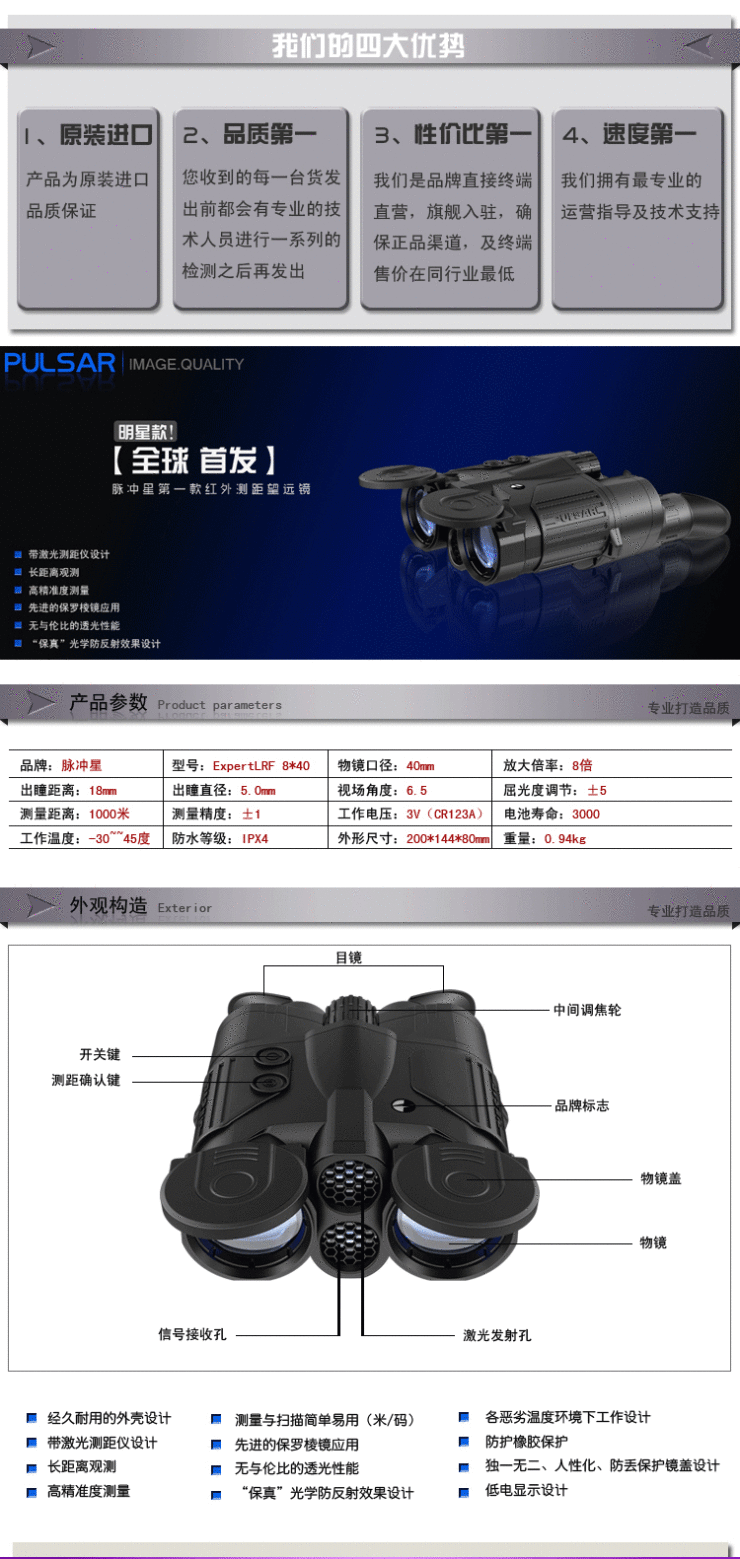 供应脉冲星pulsa ExpertLRF 8x40红外激光双筒测距望远镜