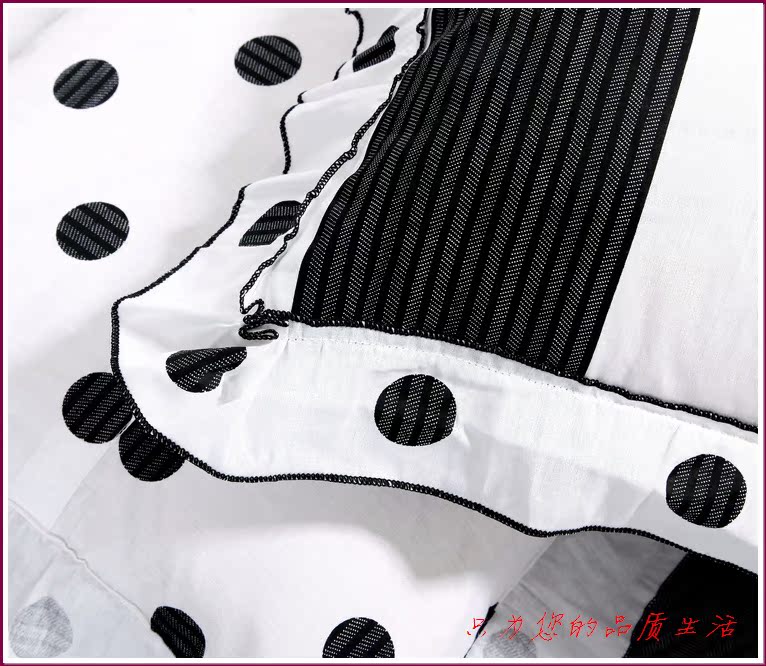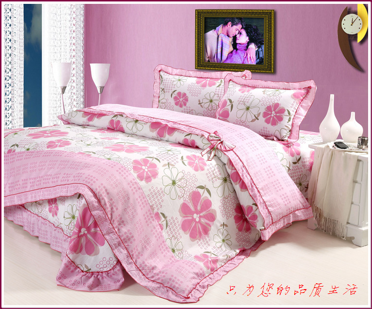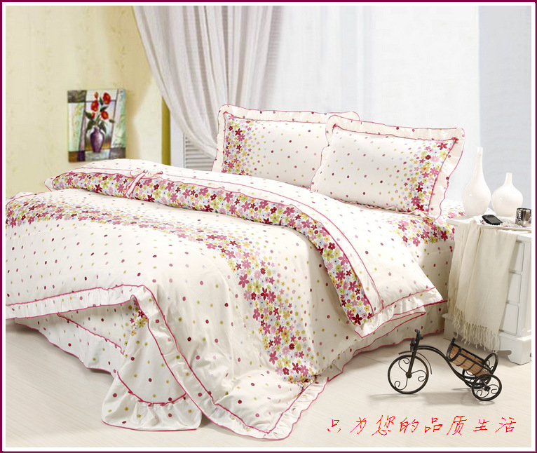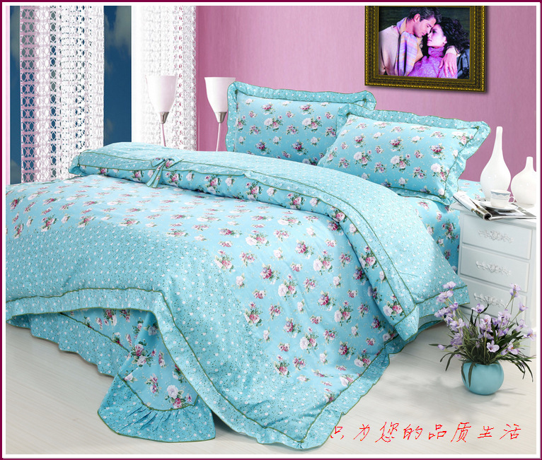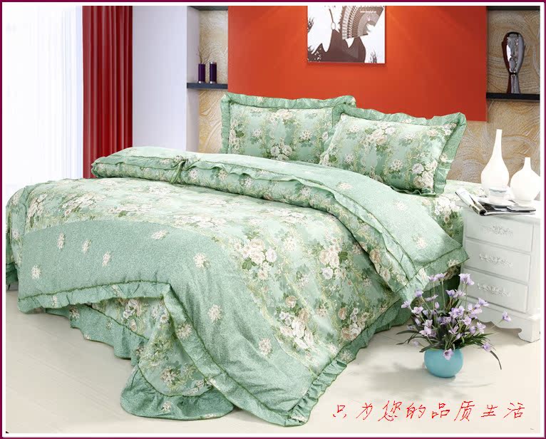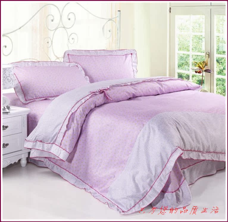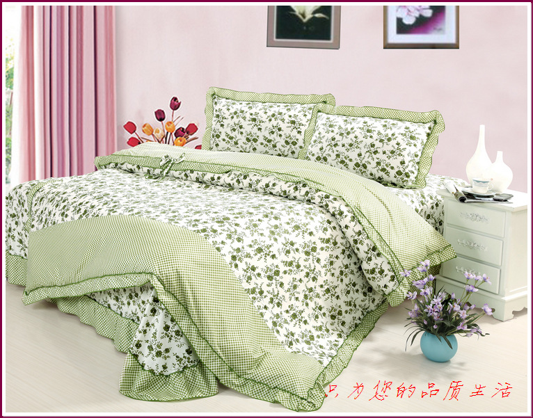环保印染,窄幅精纺斜纹纯棉面料,花式拼接,床单和被套均为荷叶边,全棉面料、不起球,众多花色可选。
