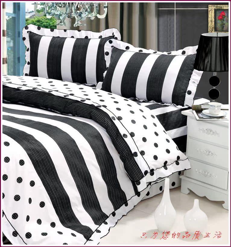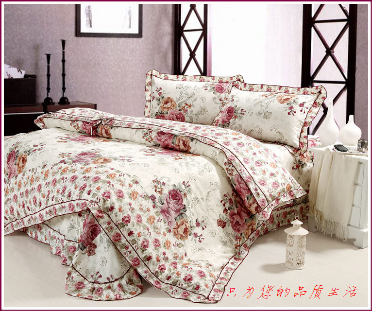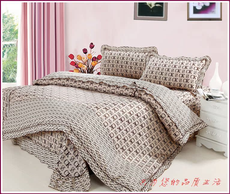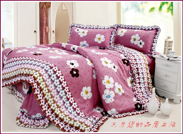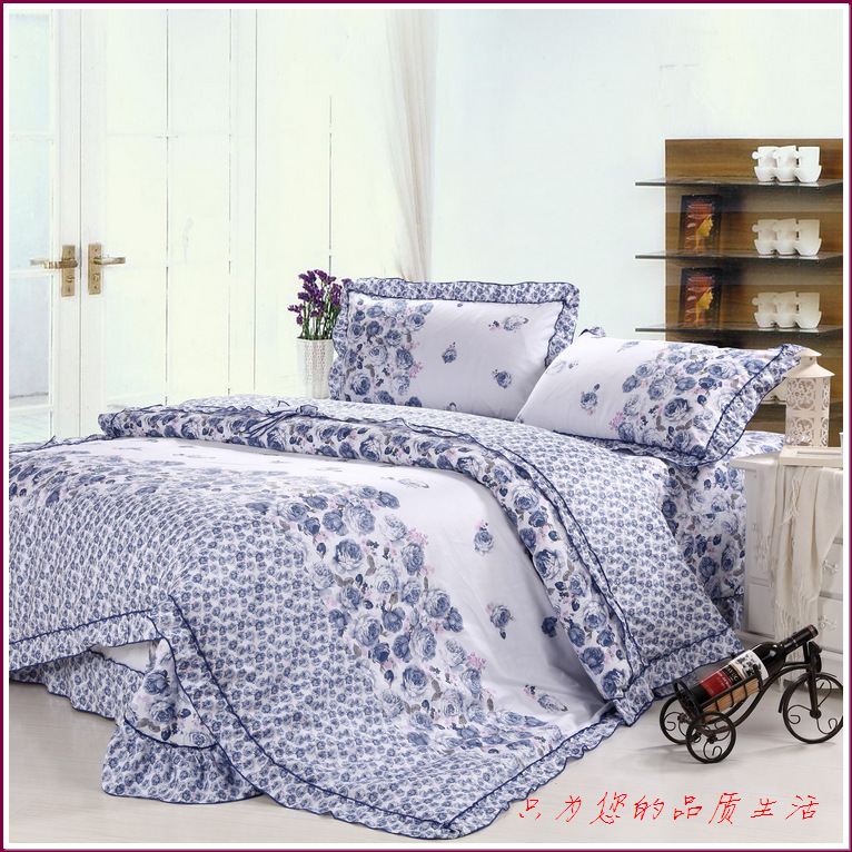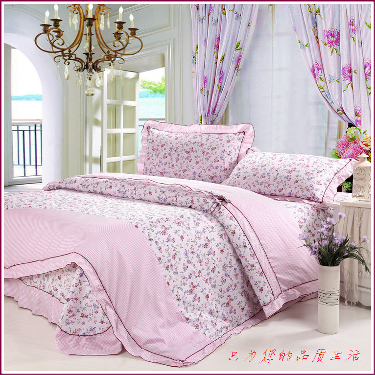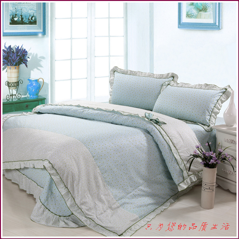 环保印染,窄幅精纺斜纹纯棉面料,花式拼接,床单和被套均为荷叶边,全棉面料、不起球,众多花色可选。