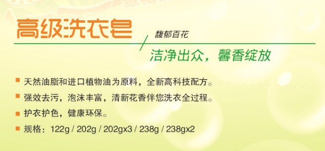 皂体温和滋润,脂肪酸比同类产品高出5%-7%,洗净力更强更耐用。