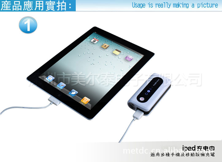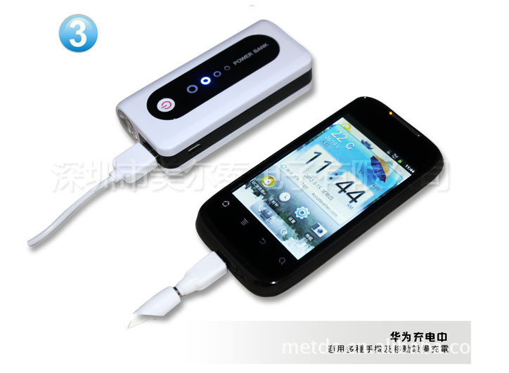 使用移动电源给手机、MP3、MP4、iphone、PSP等数码产品充电: 1. 将USB链接线链接到移动电源输出USB接口就可与iphone4充电或给手机,MP3,MP4等充电。 2. 按下开关LED灯亮起时,这意味着移动电源可以工作了。 3. 当放电时,电量LED1 2 3 4灯,以LED1亮,LED1灭,LED2亮,LED2灭,LED3亮,LED3灭,LED4亮,LED4灭,如此循环顺序亮。 4. 选择您手机或其它数码产品的正确充电接头链接至您的手机或其它数码产品。 5. 用移动电源可以不用5V数码产品在任何地点充电如下:iphone4 iphone4S、手机、MP3、MP4、PSP等等。 6. 使用后除去数码产品,等LED灭后表示已经关机。