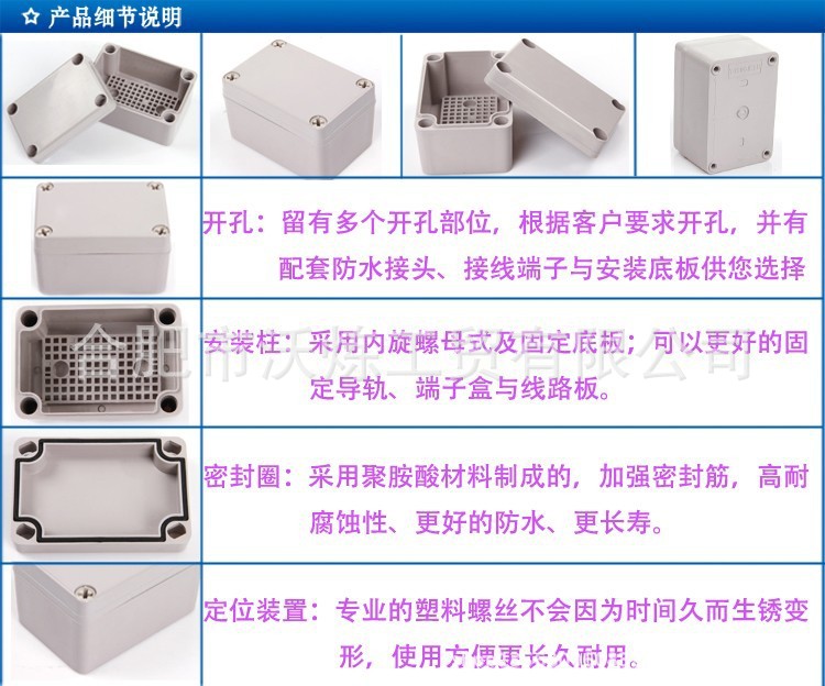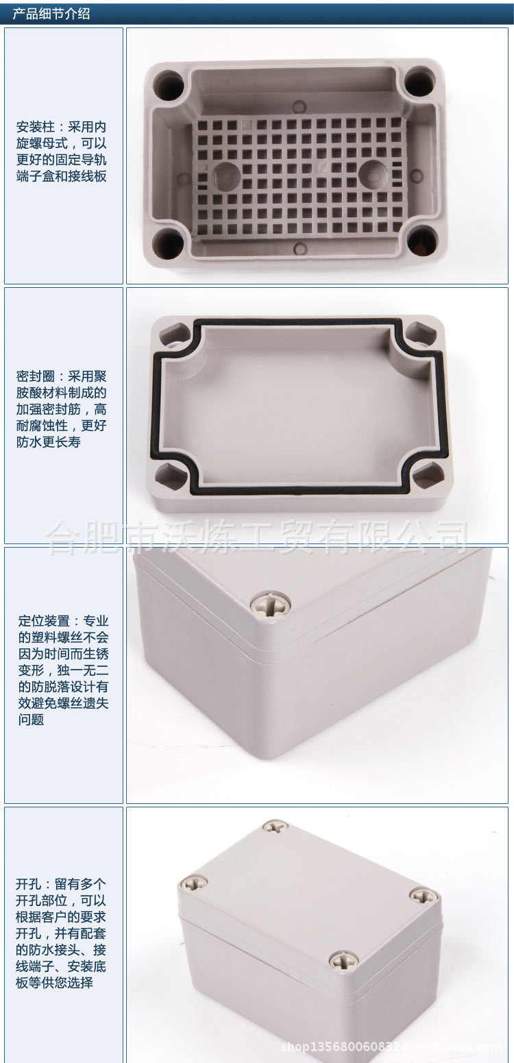 ★新一代塑料防水盒,防水箱是经过多名资深工程师研发出来的强劲性能壳体箱,箱体防水保护度IP66.,用全新料生产,做工精细,坚固耐用。