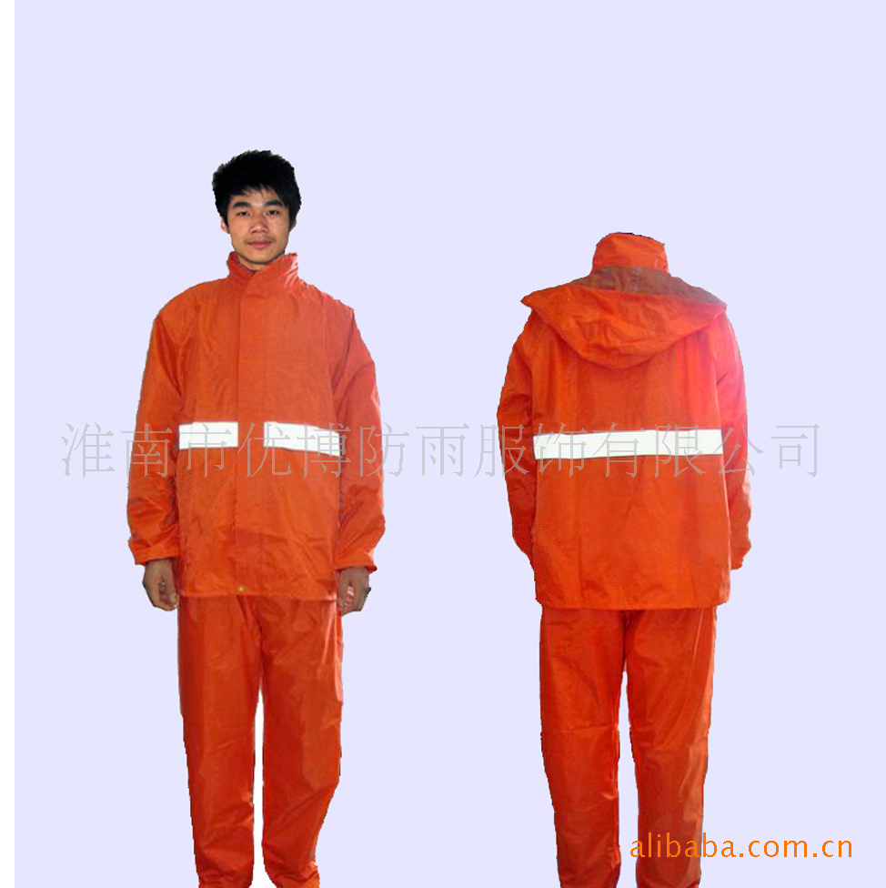 本品为高档防雨面料,加高档PU,PVC防水涂层,五公分高强度反光条,双层防沾身透气网格设计,暗藏式帽子,上下分体套装,防盗防水口袋,休闲款式!