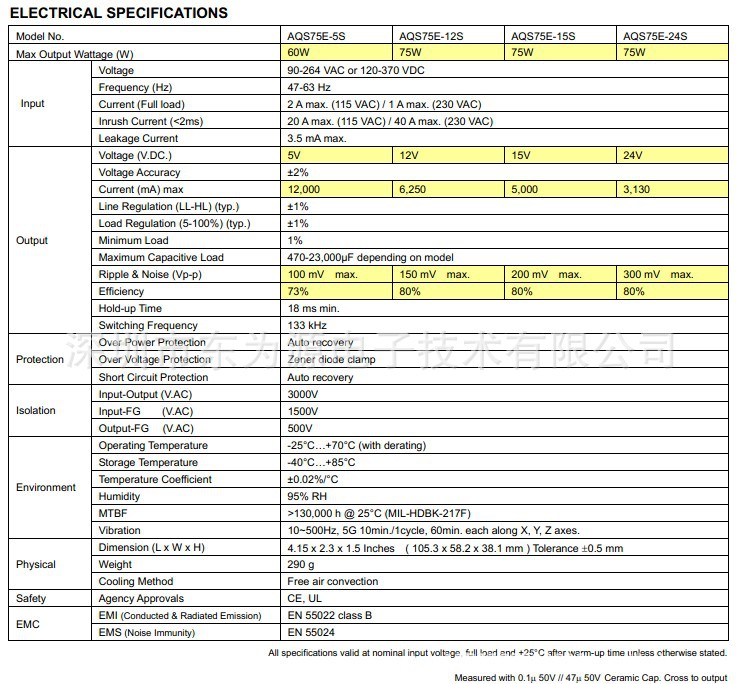 | AQS75E-12S | 220.0 | 90.0~264.0 | 80.0 | 1 | 12.0 | 6.25 | 75.0 | -40℃~+85℃ | 105.3*58.2*38.1 |