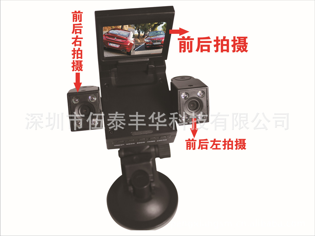 在待机或者录像模式下,点按ON/OFF键可以切换工作摄像头,出厂设置为左右双置摄像头工作模式,点按ON/OFF键时切换到右侧摄像头单独工作模式,再次点按切换到左侧摄像头单独工作模式,再次点按切换到双摄像头同时工作模式
