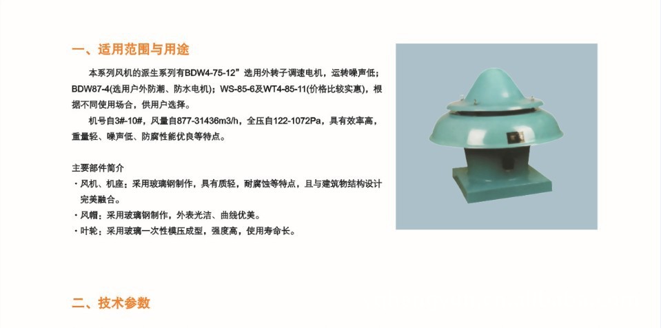 1、规格形式多,应用范围广:可根据使用场合及风量、压力和噪声的不同要求, 选用以下三种型式的风机: A、轴流式屋顶风机:型号为DWT-I型,适用于中低压、大流量的使用场合。根据 用户需要还可以设计成双向可逆式送排风,即具有正反工况等效特点的风机,如DWT-Ⅴ 型; B、离心式屋顶风机:型号为DWT-Ⅱ型、DWT-Ⅲ型二种型式,适用于风量较小而 压力要求较高的场合; C、无电机涡轮排风机:型号为DWT-Ⅳ型,是一种由室内外空气压差驱动特殊弧 型叶片随轴心转动从而排出室内空气理想的节能通风装置。 2、效率高,噪声低:本风机采用先进的CAD软件,经多目标优化设计而成。 DWT-Ⅰ型系列机号中12#-24#共八种机号风机,采用改变转速、角度和叶型的方法, 扩充性能参数范围以满足不同使用工况的需要,达到风机与系统区配,以利实现节能 和降噪; 3、运转平稳、寿命长:本风机的转动惯量小,动平稳精度高,运转平稳,且各 项性能指标的企业内近代标准中的要求均高于风机行业标准,确保风机在同行中处领 先地位; 4、适用面广:本风机可以根据使用要求,制作成防爆型,适用于易燃、易爆及 有腐蚀性气体的场合的强制排风; 5、本产品多次经省市技术监督局检测合格,用户可放心使用。