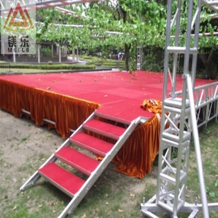 1、舞台材质:优质6061-T6航空铝合金材料,比6063的强度要好,18MM厚度的舞台多层面板,上面加一层红色地毯,美观,大气。