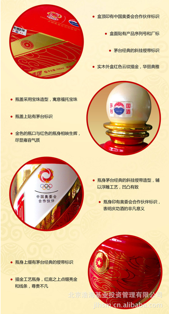 中国体育代表团庆功酒专用陶瓷酒瓶,瓶身整体采用描金工艺,即在特制陶瓷瓶身上用现代描金技术将纯金液化后在瓷胚上描绘彩纹饰,再经入窑高温烧制而成,并以浮雕勾线手法,勾勒红色云纹。整体瓶身在大面积的哑光金中,点缀亮金和线条,使整个瓶体熠熠发光,永不褪色和氧化,使这份荣耀,虽历万年,也可永世传承。瓶盖整体造型寓意福托珠宝,并用特殊材料手工打磨,使珠宝外形更加细致柔和,展现了国酒祥和大气的风采。
