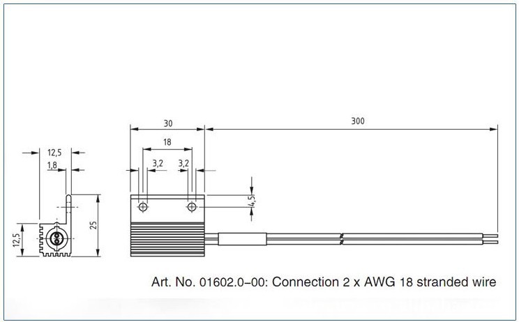 7、工作/保存温度:-45~+70℃ 产品对照表 | | 订购编号 | 功率(W) | 起动电流 | 表面温度 | 接线方式 | 重 量 | RC01602.0-00 | 8W | 2.0A | 150℃ | 2 x0.75mm硅胶耐高温电缆 | 20 g | RC01609.0-00 | 10W | 2.5A | 155℃ | 2 x 1.0mm硅胶耐高温电缆 | 30 g | RC01610.0-00 | 13W | 3.0A | 170℃ | 2 x 1.0mm硅胶耐高温电缆 | 40 g |