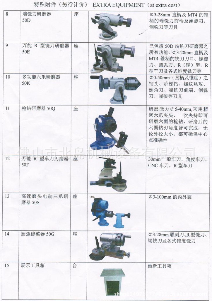 50E万能R型铣刀研磨器:可研磨3-28mm直柄及MT4的锥柄的端铣刀前端及螺旋刃、圆弧刀、R(球)型、R型车刀及各式锥度铣刀等,并包括50D端铣刀研磨器所有的功能。