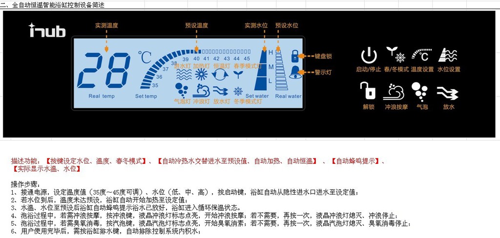 预先设置好洗浴水温和洗浴水量,进水、加热、蜂鸣提醒、保温、放水,整个过程由电脑控制自动完成,操作十分简单。