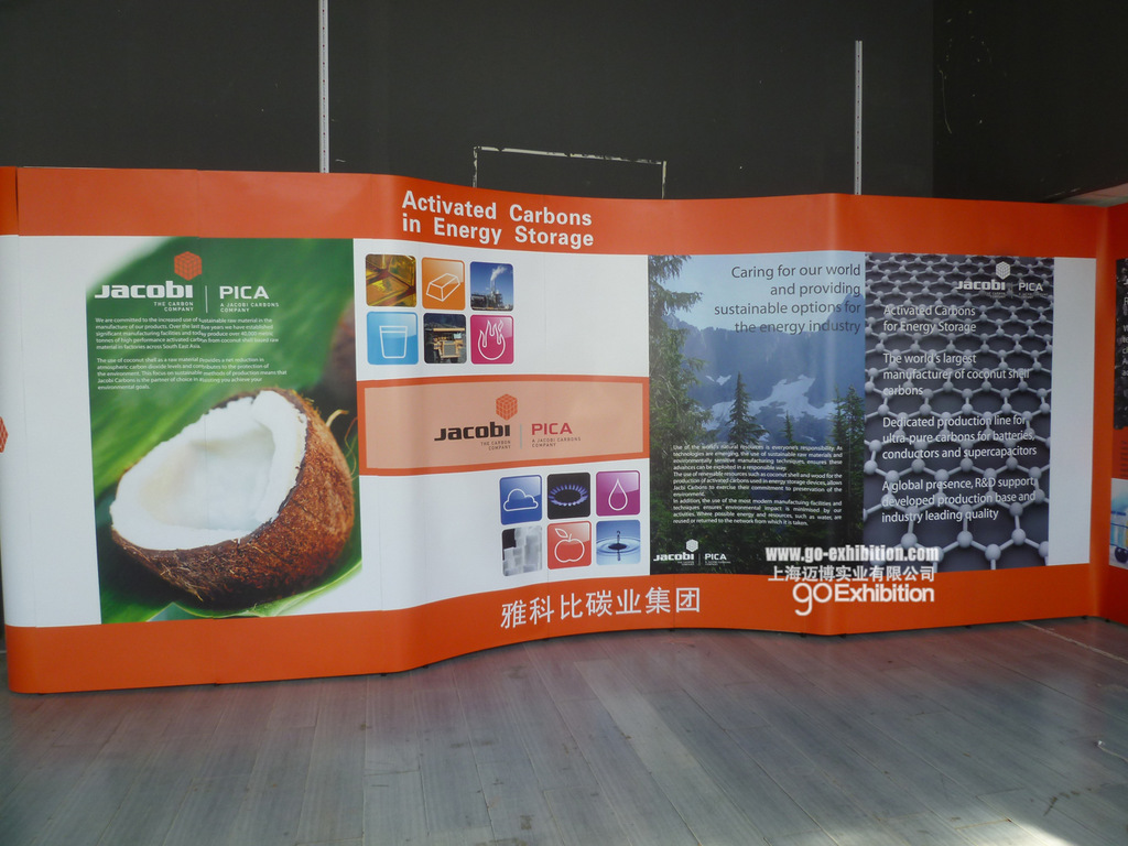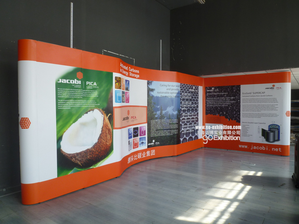 集束成捆的网架几分钟内便弹起一个大型框架,既灵活又整洁。采用独特的磁吸贴画技术,配以专用射灯,令您的展品陈列光彩夺目,易可轻松携带。