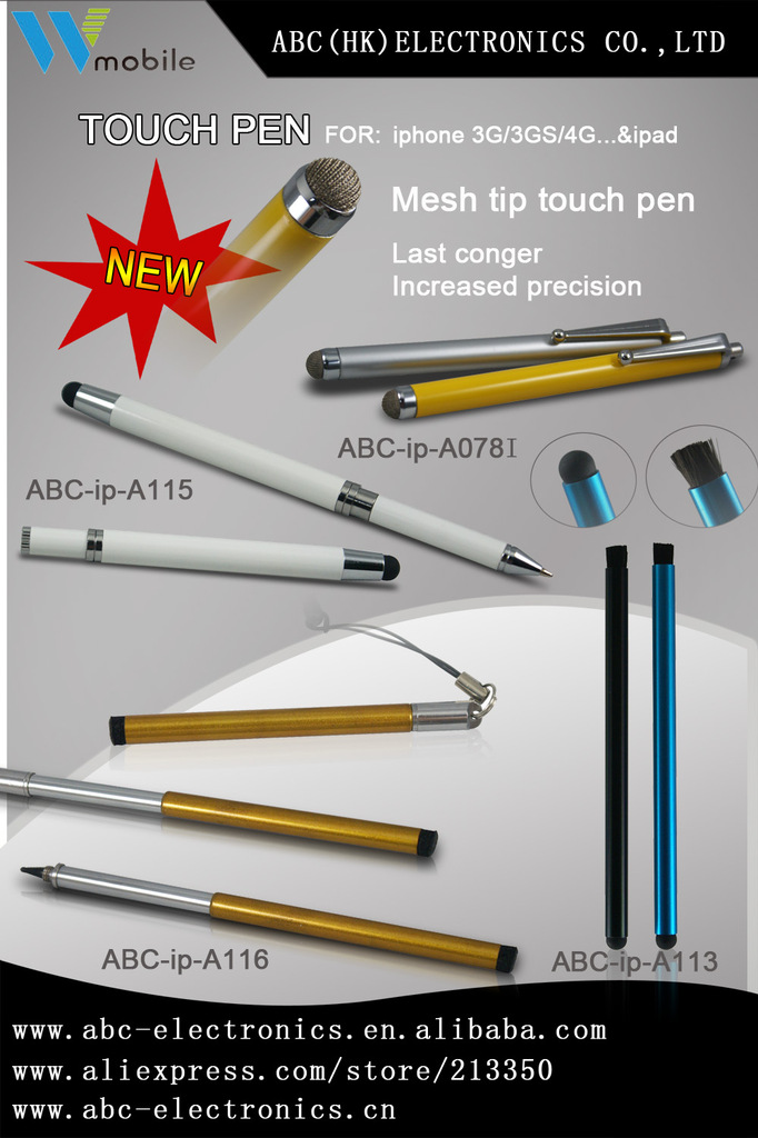 中国品牌手写笔供应商、手写笔品牌(WMOBILE)。深圳市奥必成电子科技有限公司是一家专业从事通讯配件及设备组件,集产品研发、生产、销售为一体多元化的高新技术企业。公司现有生产的产品广泛应用于多个领域,如手机及智能手机的周边配件,如iphone5/iphone4s/iphone4/i9300/i9220等型号手机的各种款式触摸笔、外壳、充电系列。自公司2010年成立以来,不懈的追求产品设计、工艺和结构的完美。细节与速度是WMOBILE人基本的行动准则。多年来我们一直在为国内外品牌机型提供完善的服务和最优质的产品,深度得到终端用用户的认可。完善的生产解决方案为品质打下坚实的基础,如宇龙、天语、金立、TCL、华为、中兴、三星等优质品牌的通讯终端提供最完美的配件。WMOBILE的设计人员均来自设计公司或通讯终端公司,故能于客户一起设计,生产时去发现并解决一些问题,而不只是提供产品。在品质保证方面,WMOBILE拥有手写笔、保护壳业界最为完善的可靠性测试设备,如手写笔Y轴X轴拉、手写笔笔尖划伤测试机、笔杆万能材料试验机、盐雾测试机、冷光源测试箱。为您提供更完美、更独到的产品,我们一直在努力!真诚期待在相关业务上能与贵司开展多层次的合作。
