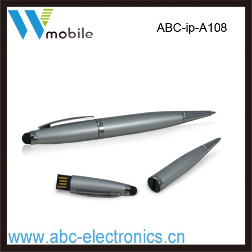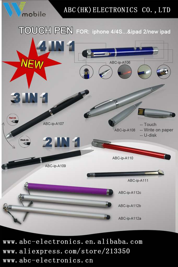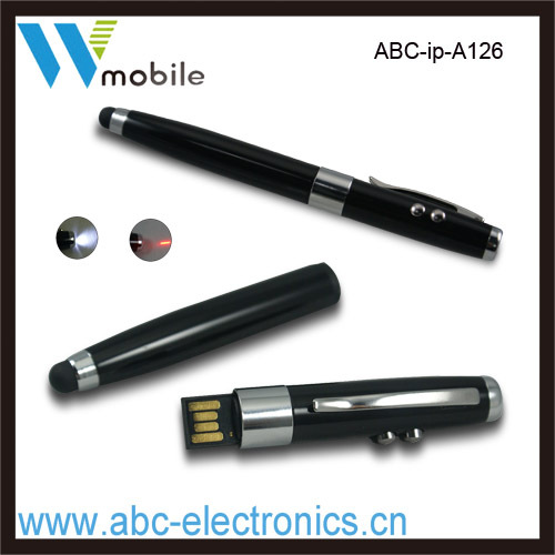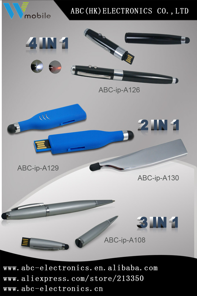 该款4合1多功能电容手写笔,有电容屏手写、U盘电子存储、激光教鞭、LED照明四种功能。可做到2G\\4G\\8G\\16G\\32G等高容量。采用全新高品质铝管,表面经过环保氧化处理,可氧化出任何颜色(前提是必须有一定的量),笔头是用高品质100%硅胶注塑成型,再喷上手感油,减少与屏的摩擦,减少阻力,使在电容屏上书写流畅,笔随心动。