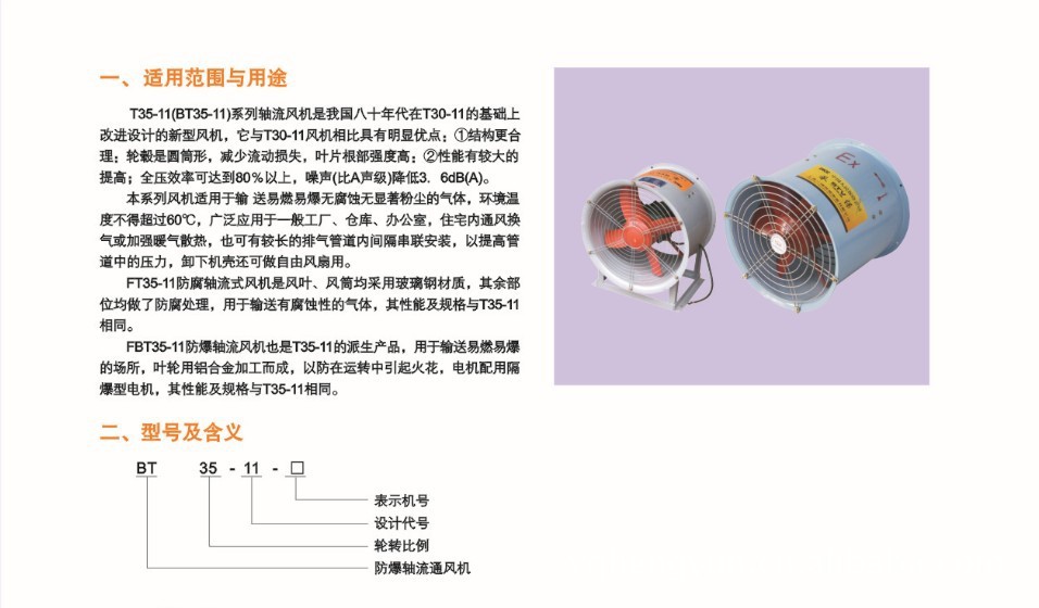 过60℃,广泛应用于一般工厂、仓库、办公室、住宅内通风换气或强暖气散热,也可有较长的排气管道内间隔串联安装,以提高管道中的压力,卸下电机可做自由风扇。防腐轴流式风机(FT35-11型),采用防腐材料外涂环氧漆加工而成,电机采用特种防腐电机用于输送有腐蚀性气体。防爆轴流式风机(BT35-11型),用于输送易燃易爆的气体。叶轮由铝合金加工而成,以防止在运转中引起火花,电机采用隔爆型电机。FT35-11型和BT35-11型风机的性能参数和外形尺寸均同T35-11型风机一样。风机需带支架脚和电机电压。请订货时注明。