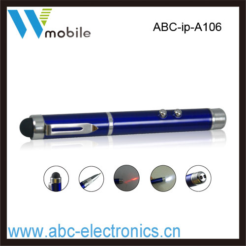 该款4合1多功能电容手写笔,有电容屏手写、纸质书写、激光教鞭、LED照明四种功能,采用全新高品质铝管,表面经过环保氧化处理,可氧化出任何颜色(前提是必须有一定的量),笔头是用高品质100%硅胶注塑成型,再喷上手感油,减少与屏的摩擦,减少阻力,使在电容屏上书写流畅,笔随心动。